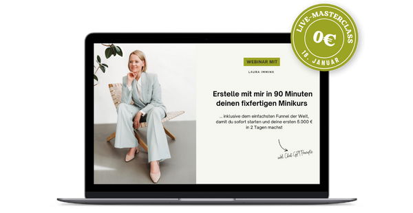 - Verkaufsfähiger Minikurs: Nach dieser Live-Masterclass hältst du dein Minkiurs-Konzept in den Händen.